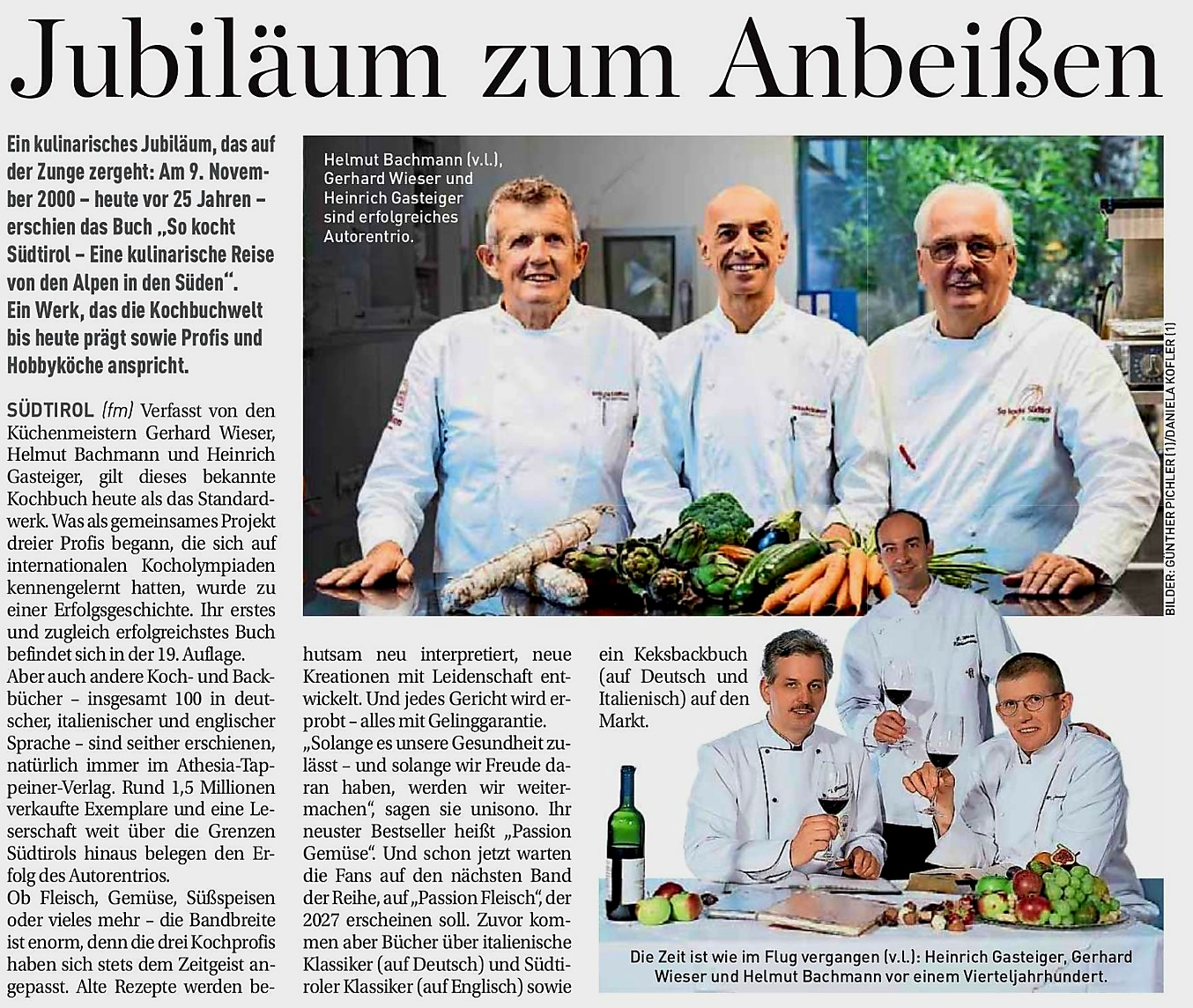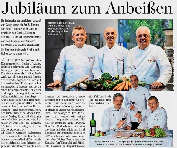 Ein Bestseller feiert Jubiläum 15 Jahre „So kocht Südtirol“ Als eine dem Erlebnis Kochen gewidmete Huldigung – so kann man die Bücher der 3 Bestsellerautoren Heinrich Gasteiger, Helmut Bachmann und...
